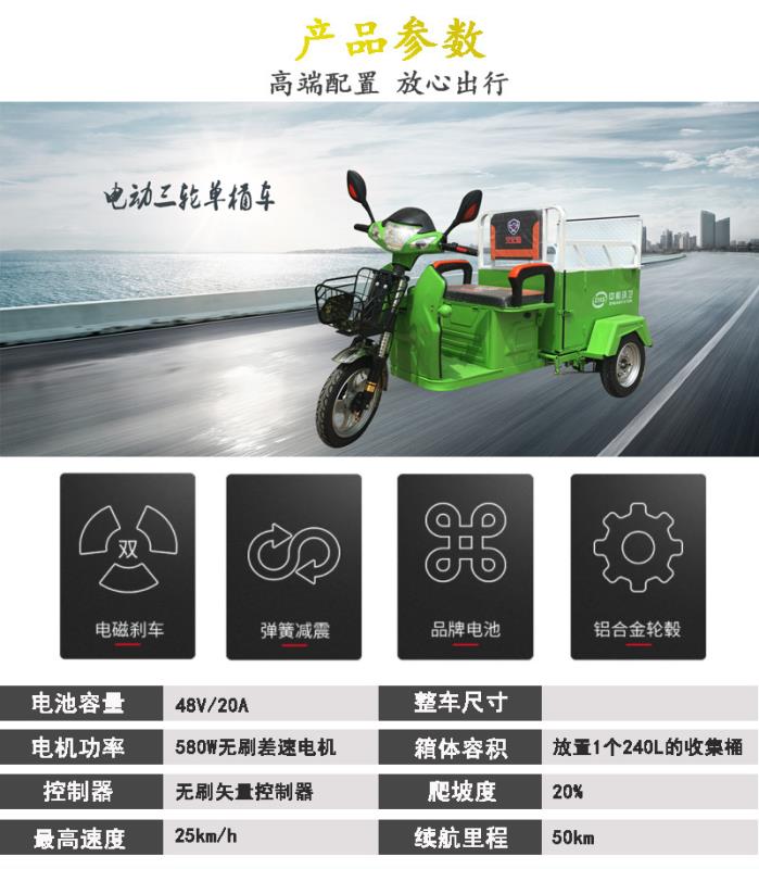 產(chǎn)品簡(jiǎn)介:型號(hào):通用1系 ZT1-1; 1、續(xù)航里程:50km;轉(zhuǎn)彎半徑:3m;爬坡度:25度;最高時(shí)速:25km/h;2、電池:48V/20AH水電池;電機(jī):580W;箱體:可放置240L垃圾桶;額定裝載質(zhì)量:100KG