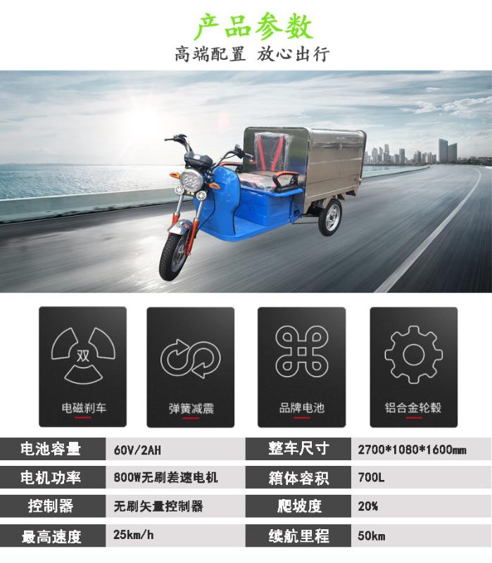 產(chǎn)品簡(jiǎn)介:型號(hào):華保3系-3 QY3-3;電池:60V/20A電機(jī):800W整車尺寸:2700*1080*1600mm箱體容積:700L